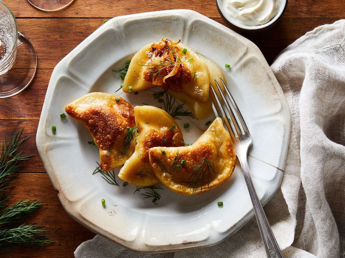 Pierogies are soft dumplings stuffed with a variety of savory or sweet fillings. They can be boiled or fried and served with sauce or cream on top or the side. They're definitely what you call comfort food.