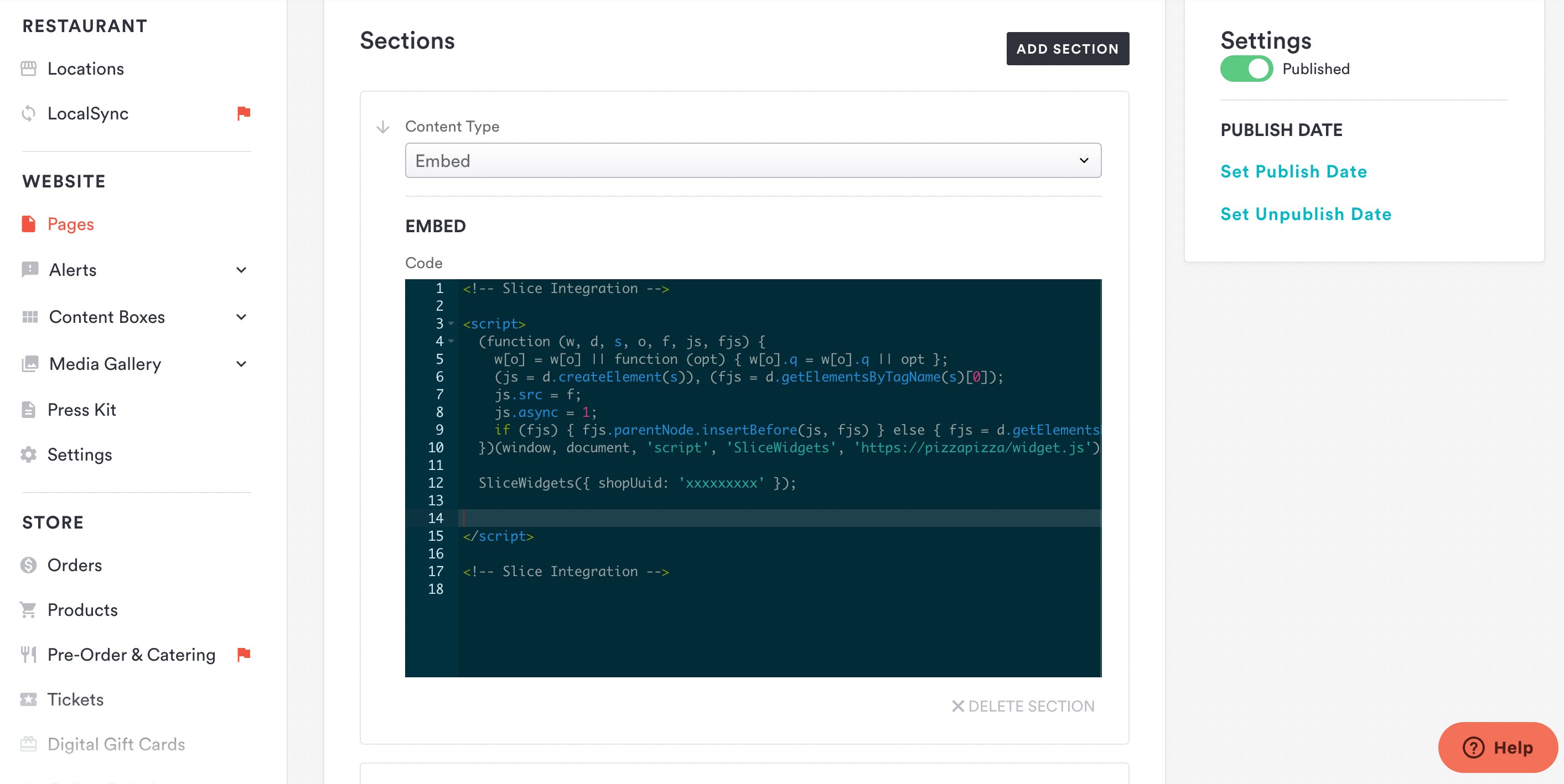 The code you're given will look something like this example image. You'll notice "script" at the beginning and end. This image is an example only. Your code will have a unique restaurant ID specific to your shop.