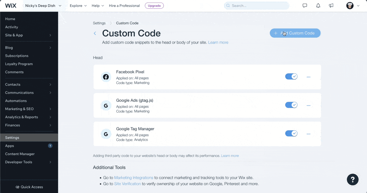 Stay in this Custom Code section of Wix and repeat for each location, adding new code snippets for each restaurant.