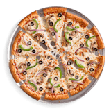 Traditional crust brushed with garlic butter and topped with zesty parmesan ranch sauce, 100% real cheddar cheese, mushrooms, red onions, green peppers, tomatoes, and parmesan oregano seasoning.