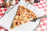 NY style deep dish slice with a rich pesto sauce, mozzarella, and parmesan cheese.