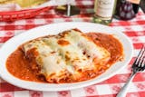 Manicotti shells baked in alfredo sauce, sautéed mushrooms, and mozzarella cheese.