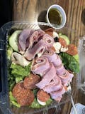 Romaine, tomatoes, cucumbers, black olives, mushrooms, pepperoni, ham, mortadella, Proscuitto, capicola, provolone.