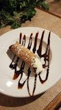 New York-style cheesecake topped with chocolate and caramel sauce and chopped pecans.