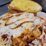 A heaping serving of spaghetti covered with our marinara sauce and three cheeses baked and topped with a 6 oz. baked chicken breast sprinkled with parmesan cheese, served with our garlic toast.