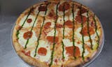 Tri White Pizza Housemade vodka sauce, pesto sauce & tomato sauce & mozzarella