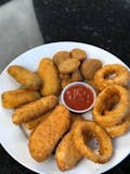 Onion rings, chicken tenders, mozzarella sticks and zucchini slices.