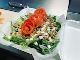 Topped with mushrooms, tomatoes, green peppers, onions, and olives
