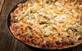 Gourmet Italian sausage, meatballs, pepperoni, Canadian bacon, onion, black & green olives, mushroom & green pepper with tomato and bacon on top of a thin crust with a rolled edge.
