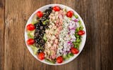 Romaine & iceberg lettuce, spinach leaves, green pepper, red onion, black & green olives, pepperoni, Canadian bacon, grape tomatoes, mozzarella cheese & shaved asiago cheese.