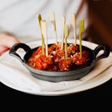 Ground meat rolled into small spheres, prepared with bread crumbs, minced onion, eggs, butter, and seasoning.