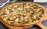 Our artisan thin crust, topped with creamy garlic sauce*, dairy free mozzarella, grilled chicken raised without antibiotics, crispy bacon, marinated artichoke hearts, fresh spinach, zesty herbs.