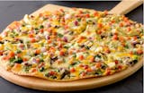 Our artisan thin crust, topped with creamy garlic sauce*, dairy free mozzarella, fresh spinach, sliced zucchini, sliced mushrooms, marinated artichoke hearts, roma tomatoes, mixed onions.