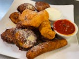 A combination of mozzarella sticks, fried zucchini, fried ravioli, and chicken strips served with marinara and ranch dressing. No substitutions.