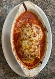 Chicken cutlet with marinara sauce topped with mozzarella cheese.