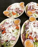 Lettuce, tomato, ham, salami, pepperoni, cheese, pepperoncini, olives.