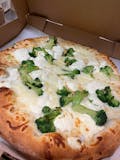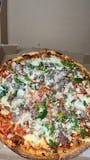 Tomato sauce, fresh mozzarella, roasted mushrooms, black olives, onions, and green peppers. Vegetarian.