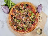 House-made sauce, four cheese blend, mushroom, pepperoni, sausage, green bell pepper, red onion, black olive, fresh garlic, bacon, oregano.