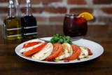 Layers of sliced fresh homemade mozzarella and fresh tomatoes accompanied with basil and red onions, drizzled with extra virgin olive oil and a balsamic vinegar reduction.