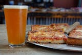 House specialty "upside-down" rectangle pizza with sliced whole milk mozzarella then topped with tomato sauce, sprinkled Parmigiano and oregano.