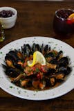 Served in a red or white wine sauce with sautéed garlic, cherry tomatoes and parsley