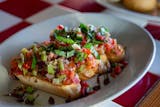 House bread topped with fresh diced tomatoes, celery, green olives and red onions with extra virgin olive oil drizzled balsamic glaze fresh basil & romano cheese.