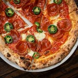 Mozzarella, parmesan, tomato sauce, pepperoni, sliced jalapenos, wildflower honey.