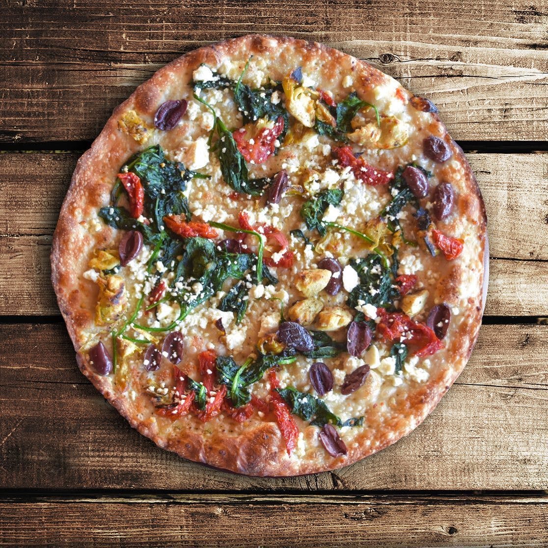 Made with our garlic and olive oil, feta cheese, sun-dried tomatoes, kalamata olives, red onions, spinach, artichokes, and topped off with Mediterranean spices.