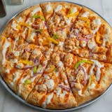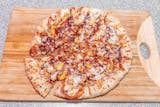 Sesame crust, BBQ sauce, cheese, Canadian bacon, pineapple, red onion, BBQ chicken.