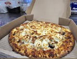 Sesame crust, white sauce, cheese, fresh mushrooms, yellow onions, fresh Roma tomatoes, chicken, roasted garlic, seasoning.