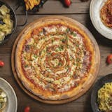 Sesame crust, white sauce, cheese, spinach, artichoke hearts, roasted garlic, oregano, sun-dried tomatoes.