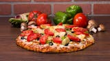 A vegetarian landmark! Loads of mushrooms, black olives, bell peppers, artichoke hearts and sliced fresh tomatoes on classic red sauce.