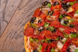 The classic combination. Pepperoni, Italian sausage, salami, linguica, beef, mushrooms, black olives, bell peppers and onion on our classic red sauce.