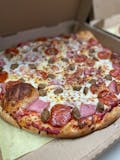 Pepperoni, Canadian Bacon, Sausage, Onions, Mushrooms, & Olives.