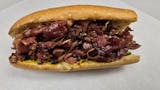 Toasted baguette with pastrami, cheese, mustard, pickles and jalapenos