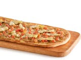 Signature garlic white sauce on our tuscany thin crust, topped with mozzarella and parmesan cheeses, all-natural grilled chicken, red onions, green onions, fresh roma tomatoes, marinated artichoke hearts, and dried basil.
