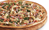 Signature garlic white sauce on our original crust, topped with mozzarella, parmesan, and cheddar cheeses, marinated artichoke hearts, fresh roma tomatoes, mushrooms, red onions, green onions, and black olives.