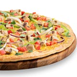 Signature garlic white sauce on our tuscany crust, topped with mozzarella cheese, baby spinach, all-natural grilled chicken, marinated artichoke hearts, red onions, cooked diced tomatoes, and chopped fresh garlic.