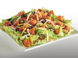Iceberg lettuce, crispy chicken tenders, red onions, fresh Roma tomatoes, cheddar cheese, mozzarella cheese, seasoned croutons, bell peppers, black olives and your choice of dressing.