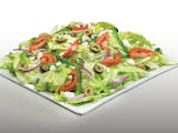 Iceberg lettuce, bell peppers, red onions, fresh roma tomatoes, green olives, green onions, feta cheese, basil, oregano, and olive oil vinaigrette or your choice of dressing.