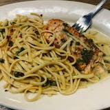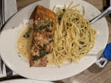 Filet of salmon sauteed with lemon, butter, garlic, olive oil, capers & white wine with a side of linguini