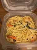 Linguini pasta sauteed shrimp in a white wine garlic cream sauce
