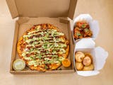 Spicy chipotle bbq sauce, red onion, charred corn, and cilantro and it comes with ranch on top!