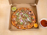 An adobada pork recipe straight from the streets of Mexico city, freshly diced pineapple, thinly sliced red onion, finely diced jalapeños, and garnish of cilantro and a lime wedge.