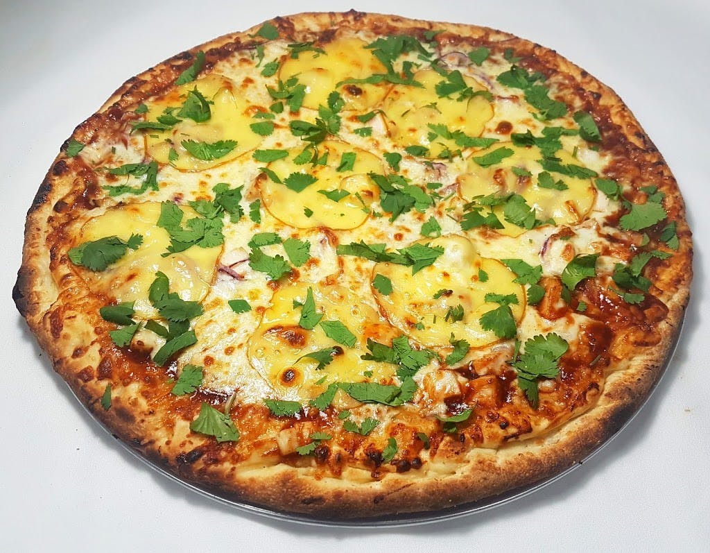 BBQ sauce, smoked gouda, mozzarella cheese, red onions, chicken, cilantro.