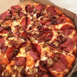 A legendary combination. Pepperoni, italian sausage, salami, linguica, mushrooms, green peppers, yellow onions, black olives on zesty red sauce.
