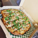 Garlic sauce, cheese, green chilies, garlic, ginger, mushrooms, red onion. Bell pepper, black olives, tomatoes, garlic chicken & fresh cilantro.