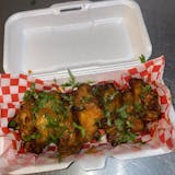 White sauce, cheese, garlic, ginger, chili. onion. tomatoes. achari gobi, jalapeños & fresh cilantro.