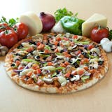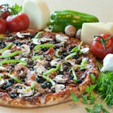 Tomatoes, bell peppers, onions, mushrooms, artichoke, olives, red sauce.