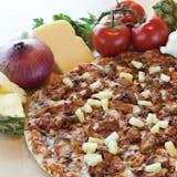 Chicken, ham, pineapple, bacon, BBQ sauce, red sauce.